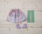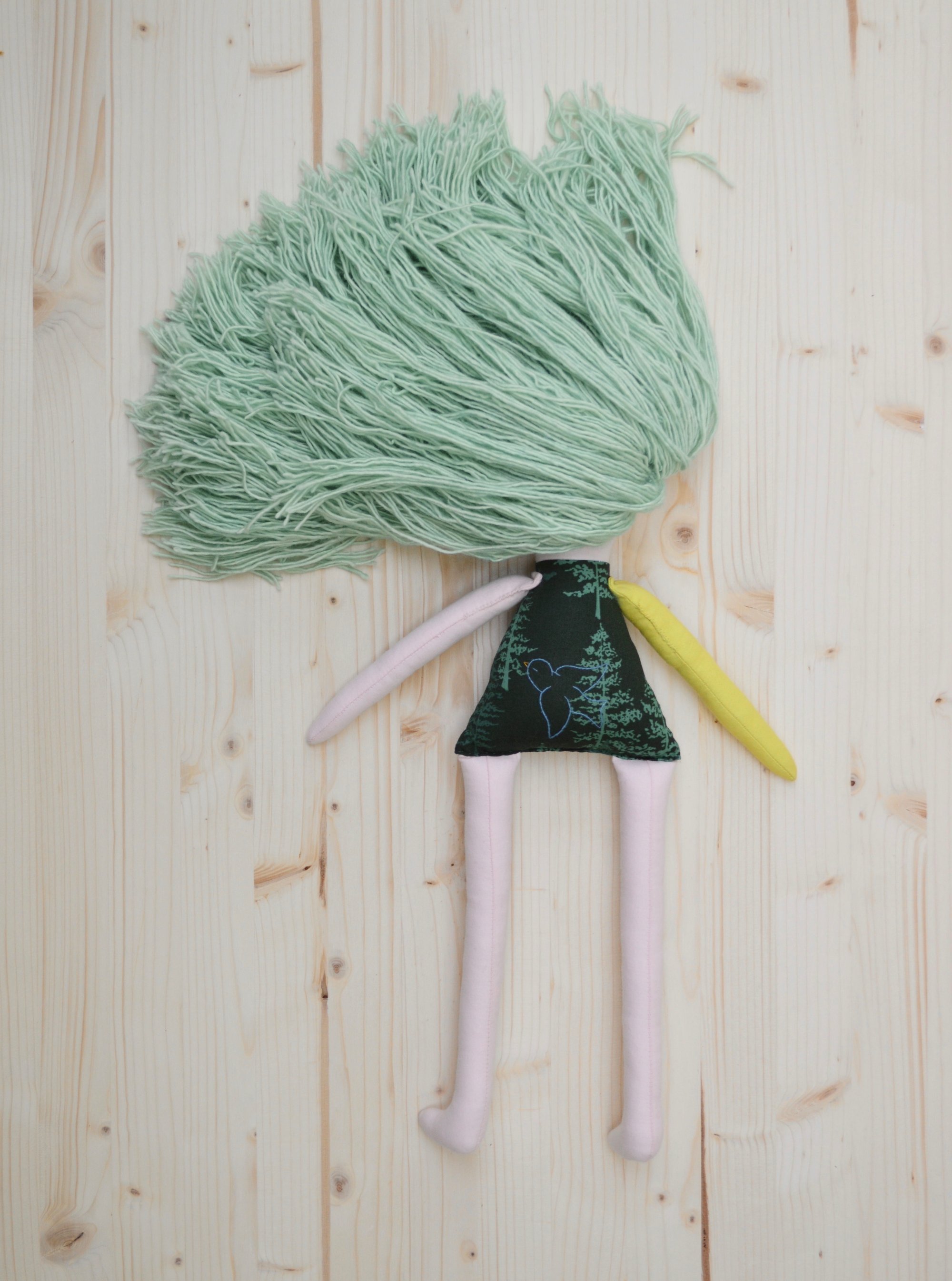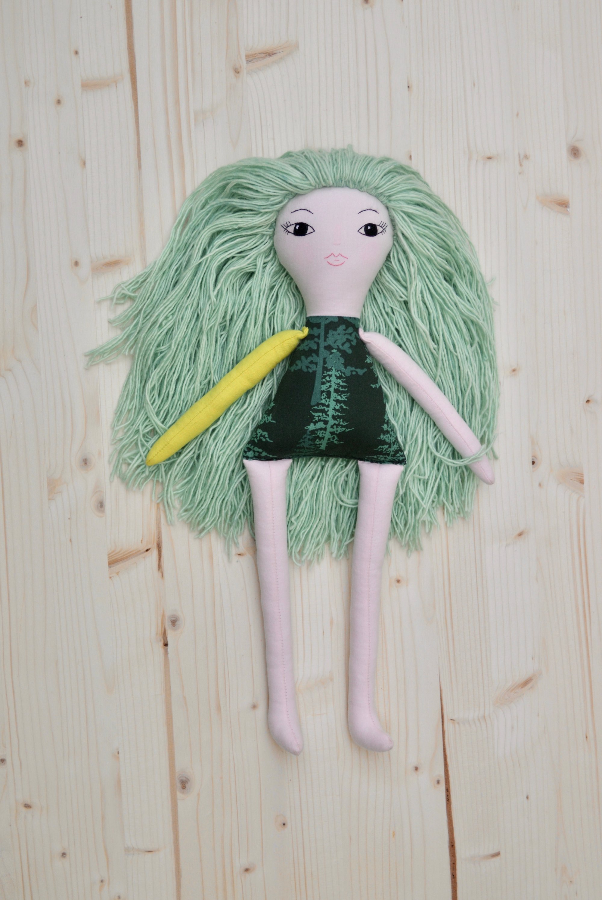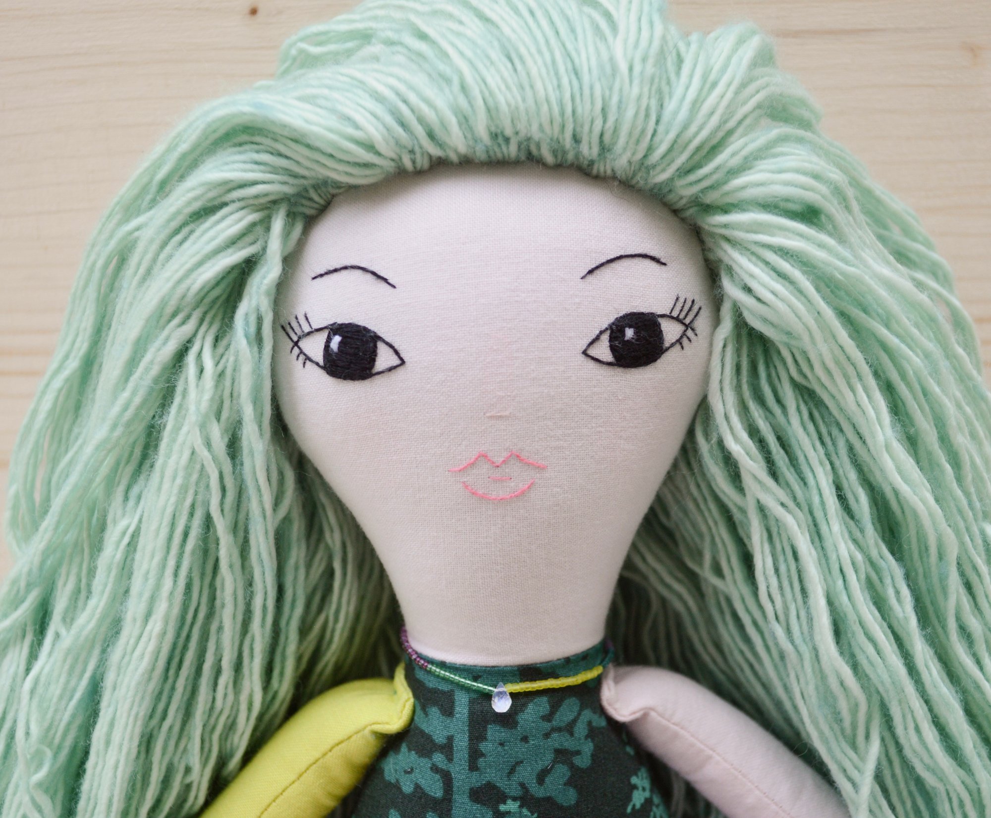 Aspen's face, left arm and legs are 100% Kona cotton. Her body, right arm and skirt are 100% cotton. Her leg warmers are a cotton jersey. Her hair is 100% wool. Her shoes are 100% felted wool. Her necklace is made of glass seed beads, a moonstone and a sterling silver clasp. She is 17".