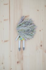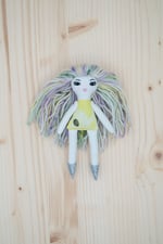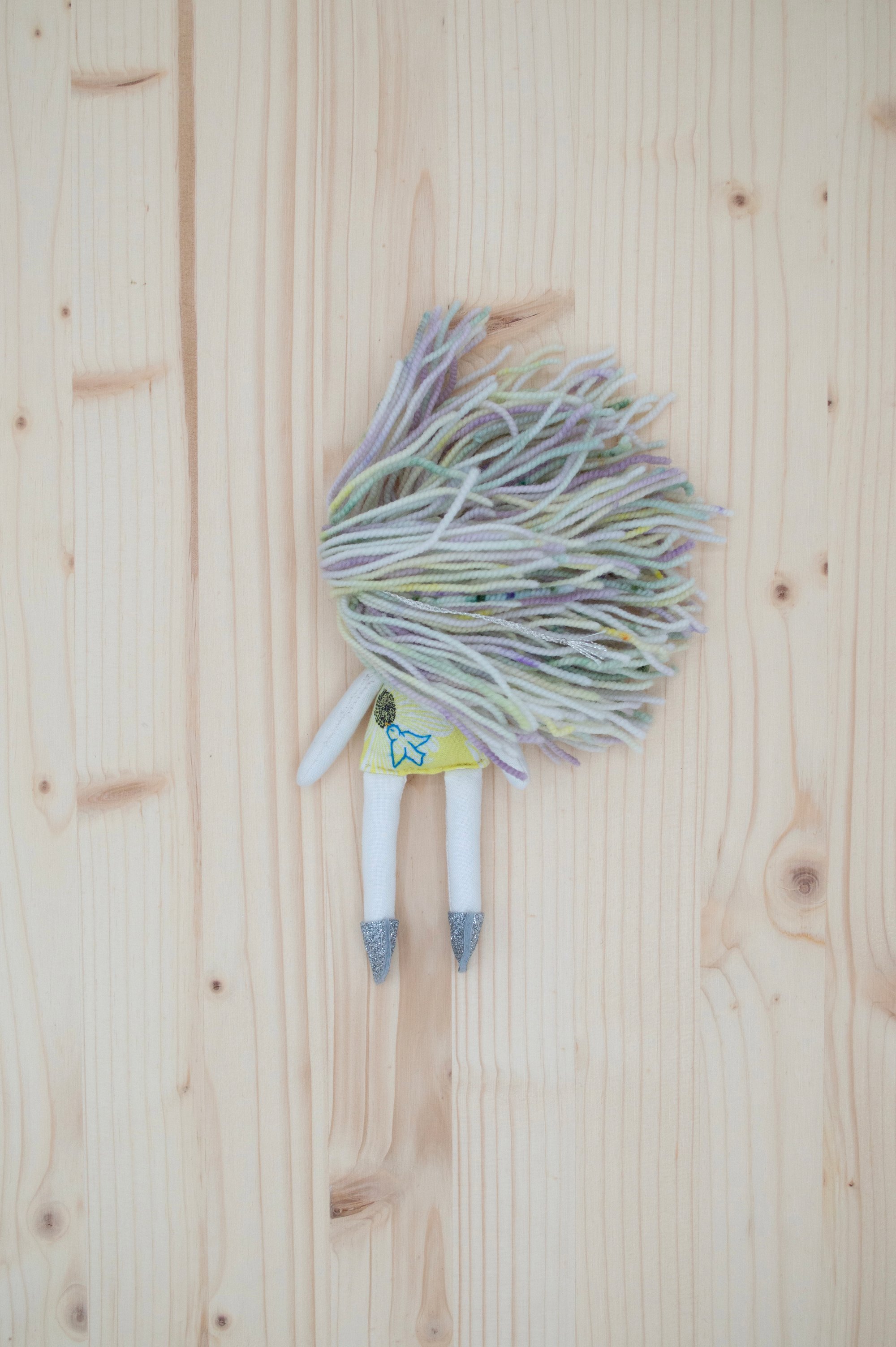 Daisy's face, arms and legs are 100% Kona cotton. Her body and skirt are 100% cotton. Her hair is 100% wool. Her shoes are 100% Bellwether wool felt with a no mess glitter finish. Her necklace is made of glass seed beads, a tiny moonstone bead and a sterling silver clasp. She is 6".
