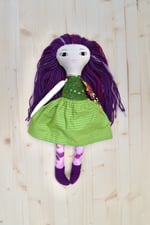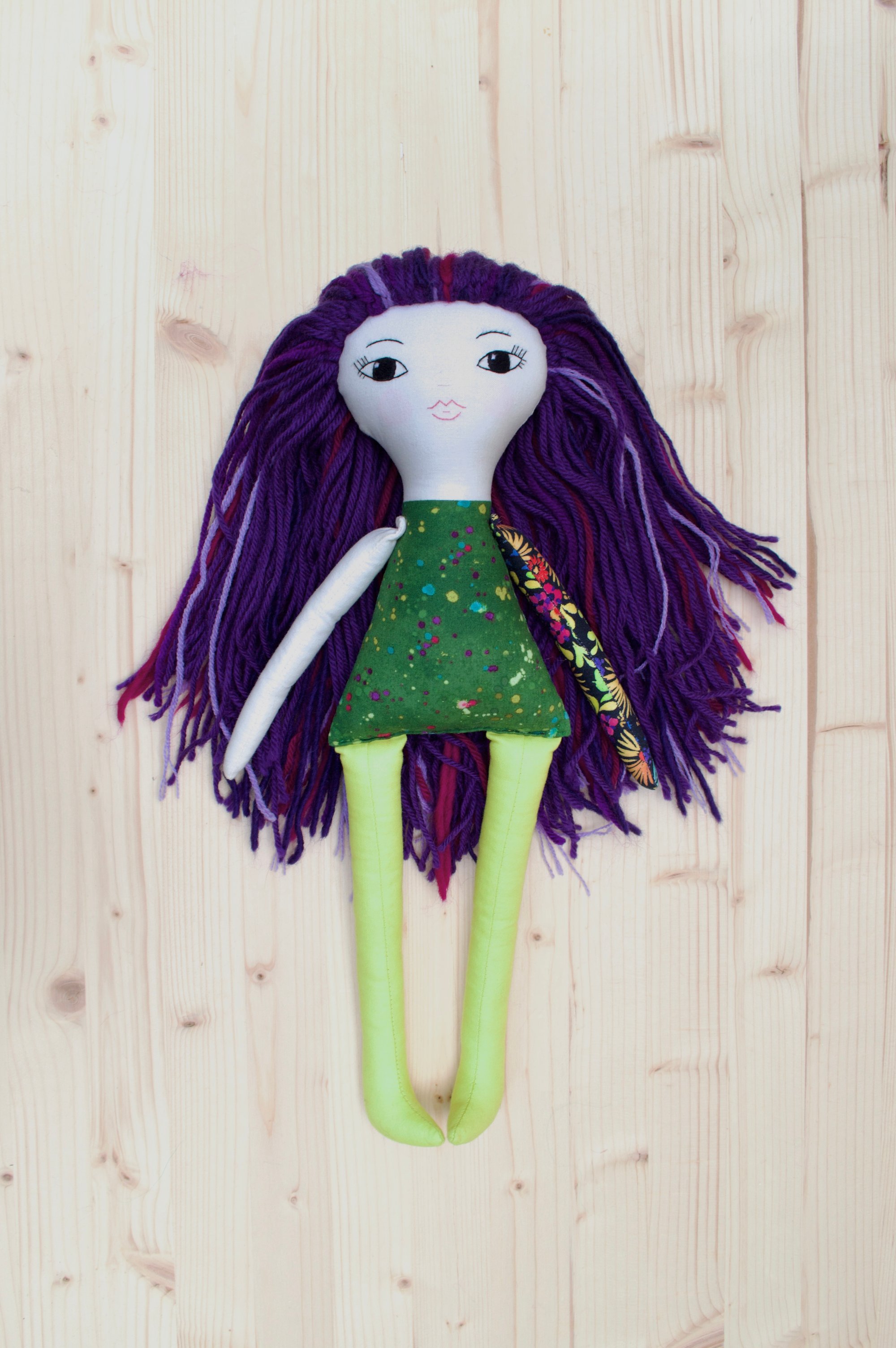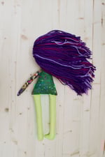 Eliza is stitched with contrast and charm as one arm soft and simple, the other blooming with flowers, as if she carries a little garden with her wherever she goes. Her violet hair makes her stand out in the sweetest way! She’s stitched to remind us that opposites can belong together beautifully, quiet and bold, soft and bright, all woven into one.