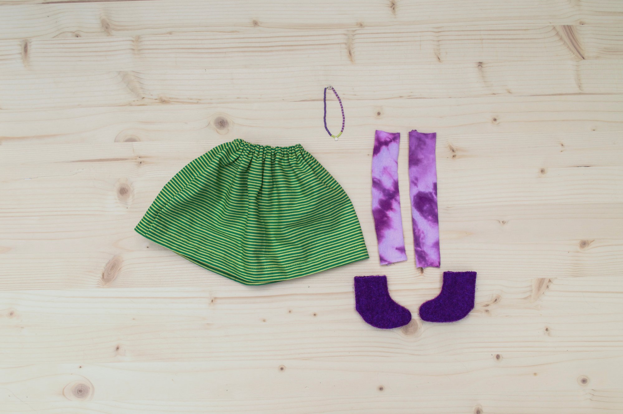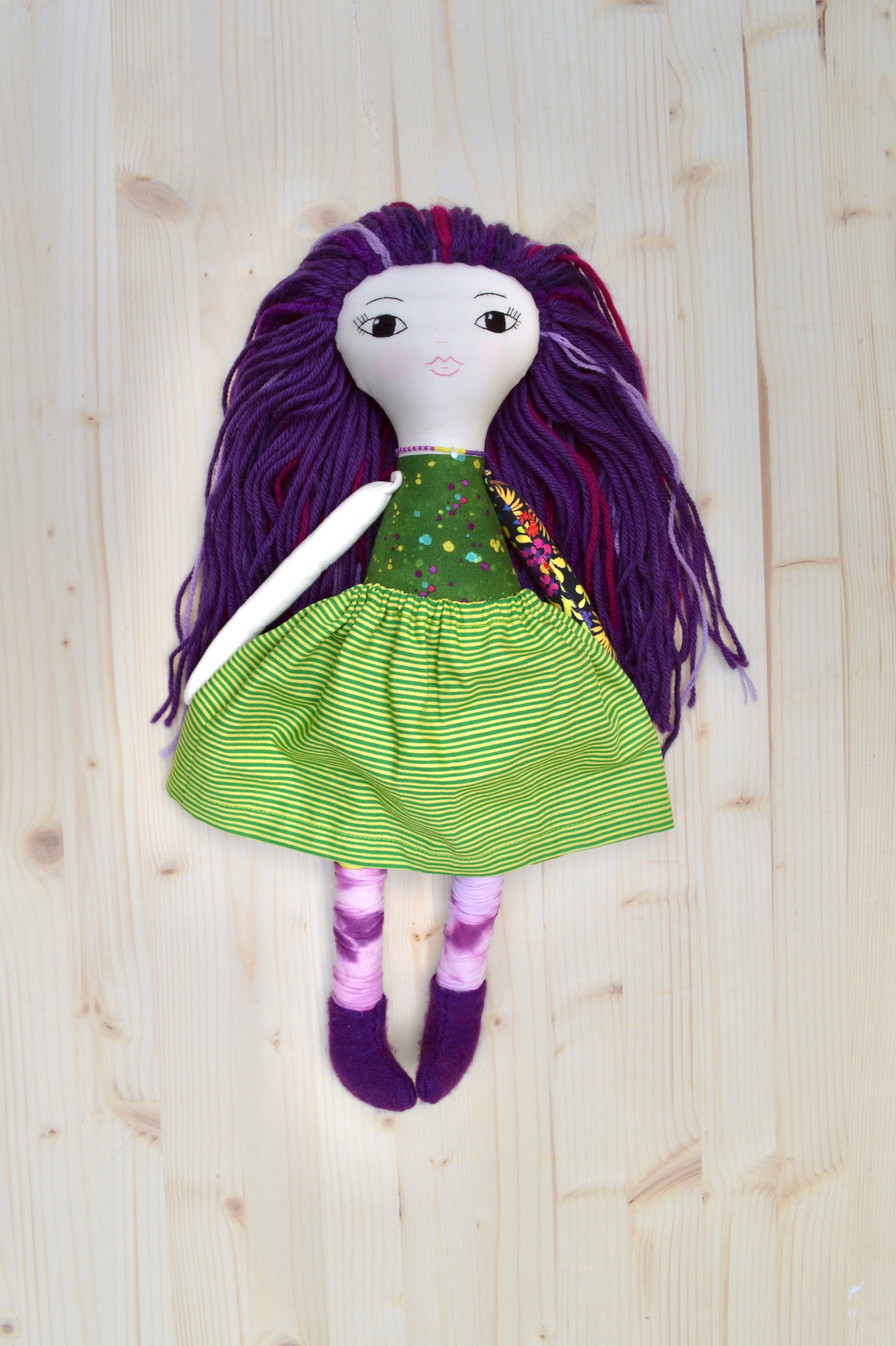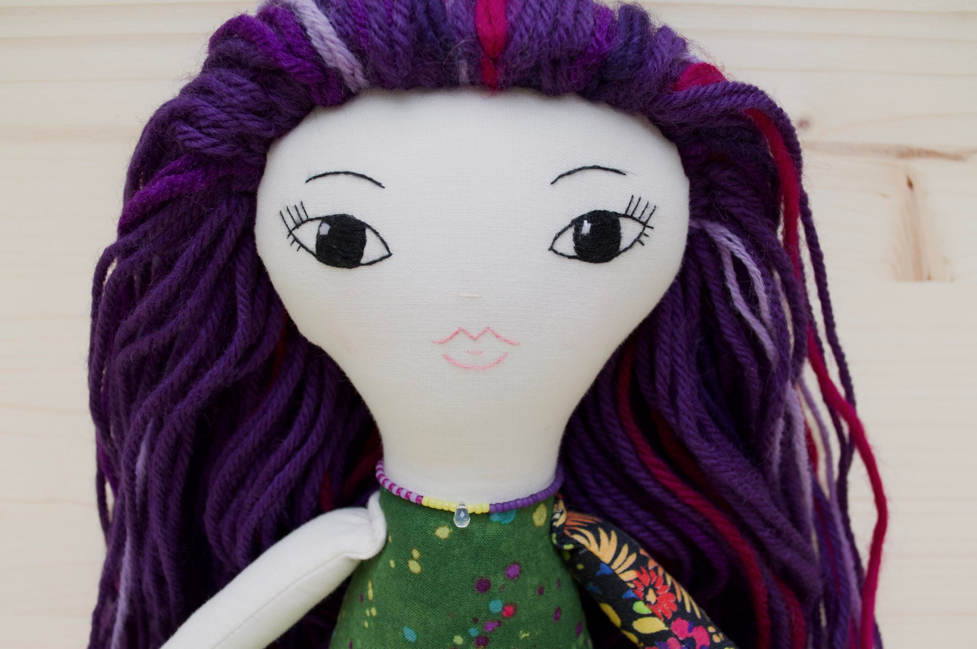 Eliza's face and right arm are 100% Kona cotton. Her body, legs, left arm and skirt are 100% cotton. Her leg warmers are a cotton blend jersey. Her hair is a wool blend. Her shoes are 100% felted wool. Her necklace is made of glass seed beads, a moonstone and a sterling silver clasp. She is 17".
