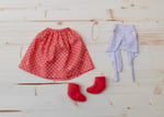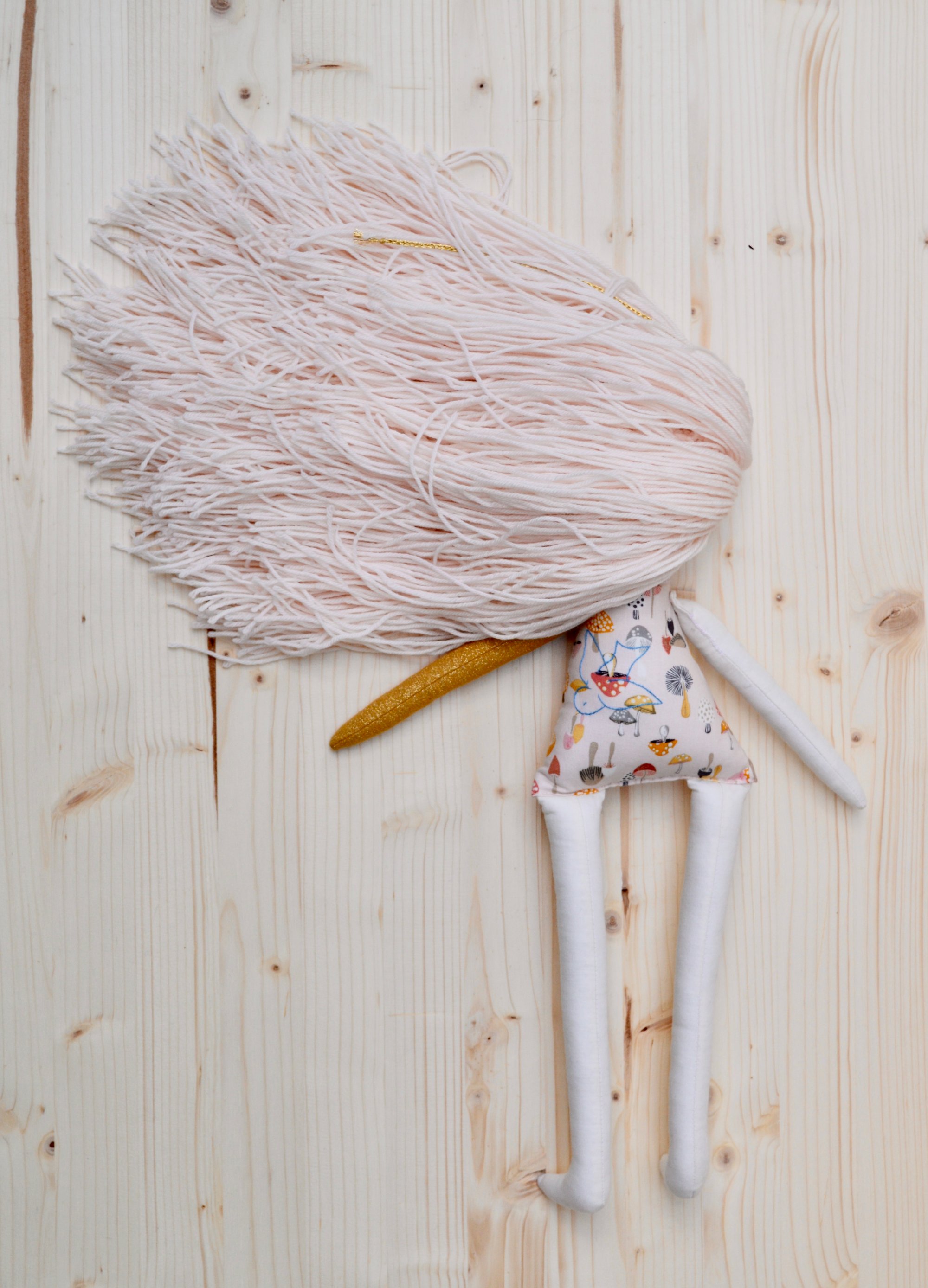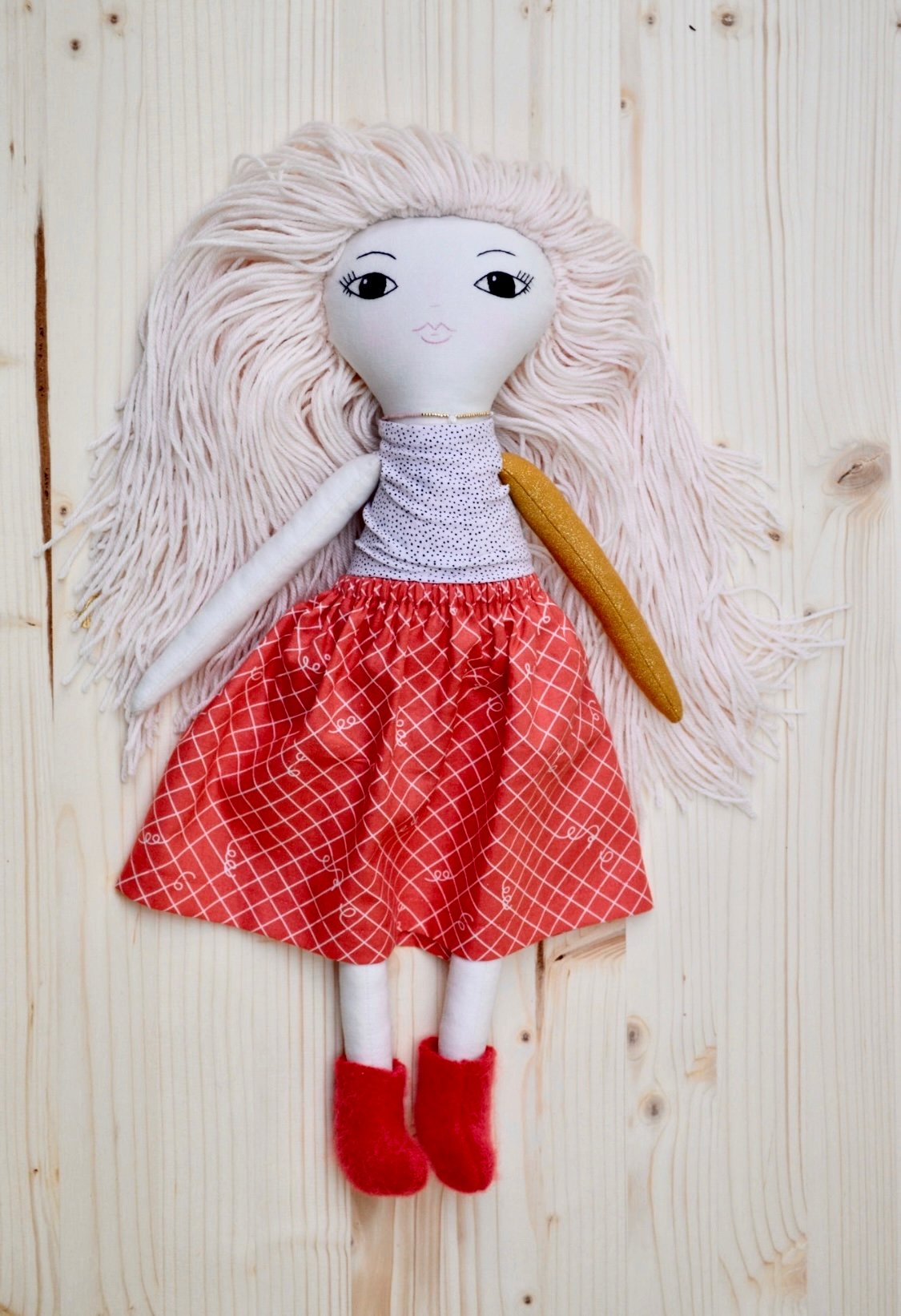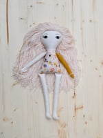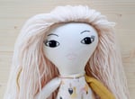 Flora's face, right arm and legs are 100% Kona cotton. Her left arm is cotton with metallic threads. Her body and skirt are 100% cotton. Her hair is 100% wool. Her shoes are 100% felted wool. Her necklace is made of glass seed beads, a moonstone and a sterling silver clasp. She is 16.5".