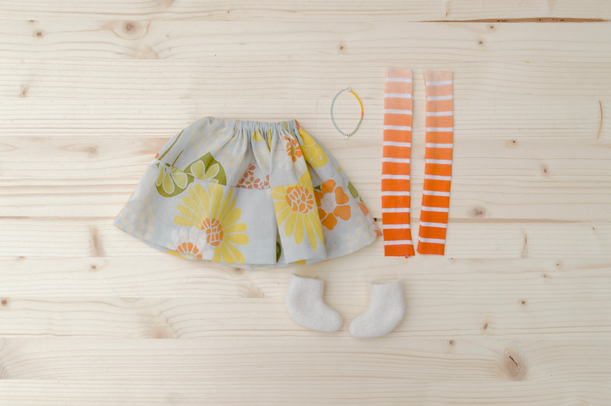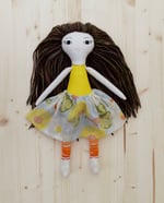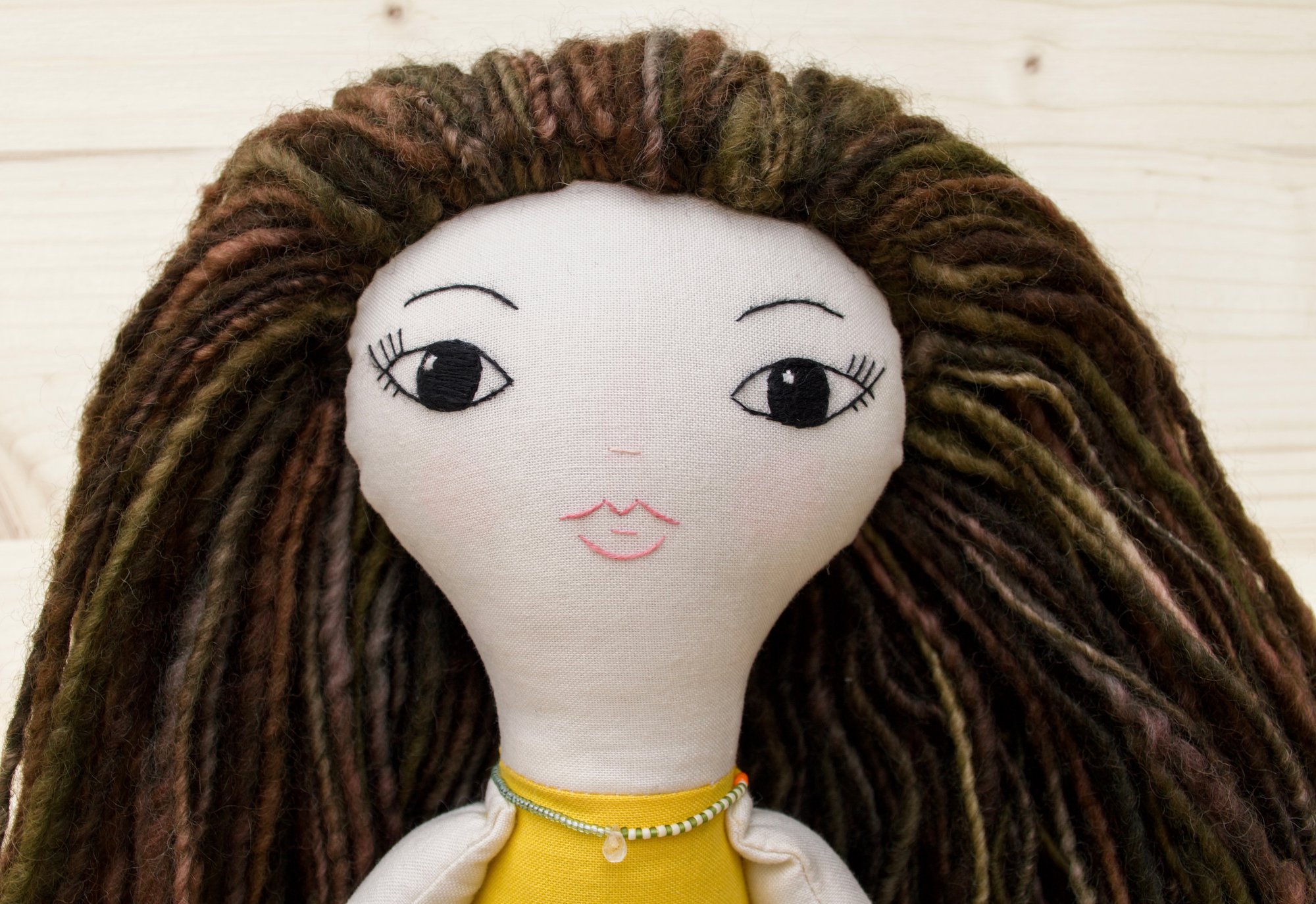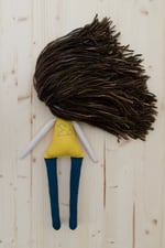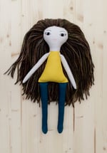 Hazel's face and arms are 100% Kona cotton. Her body and skirt are 100% cotton. Her legs are 100% silk. Her hair is 100% wool. Her leg warmers are a cotton blend jersey. Her shoes are 100% felted wool. Her necklace is made of glass seed beads, a moonstone and a sterling silver clasp. She is 17".