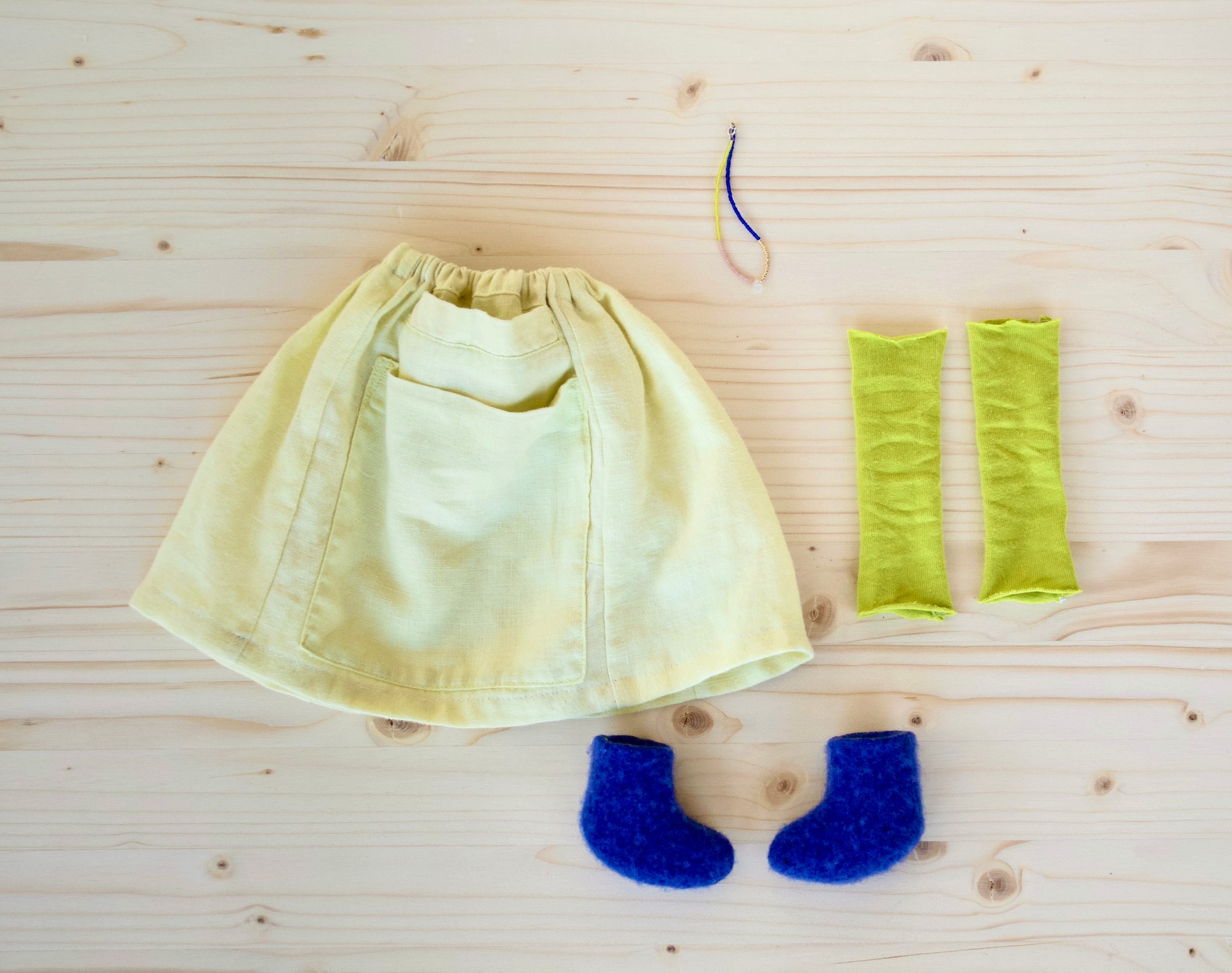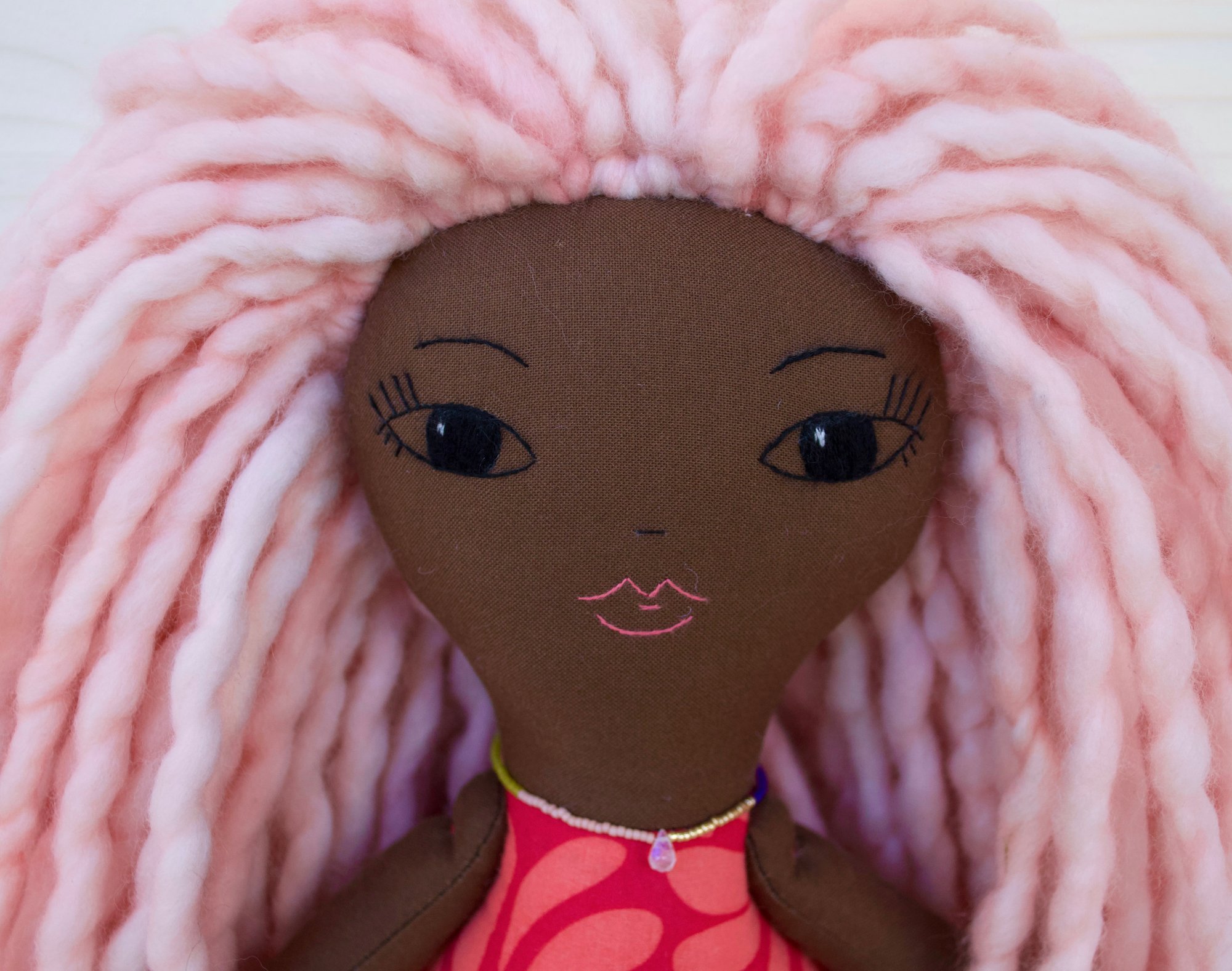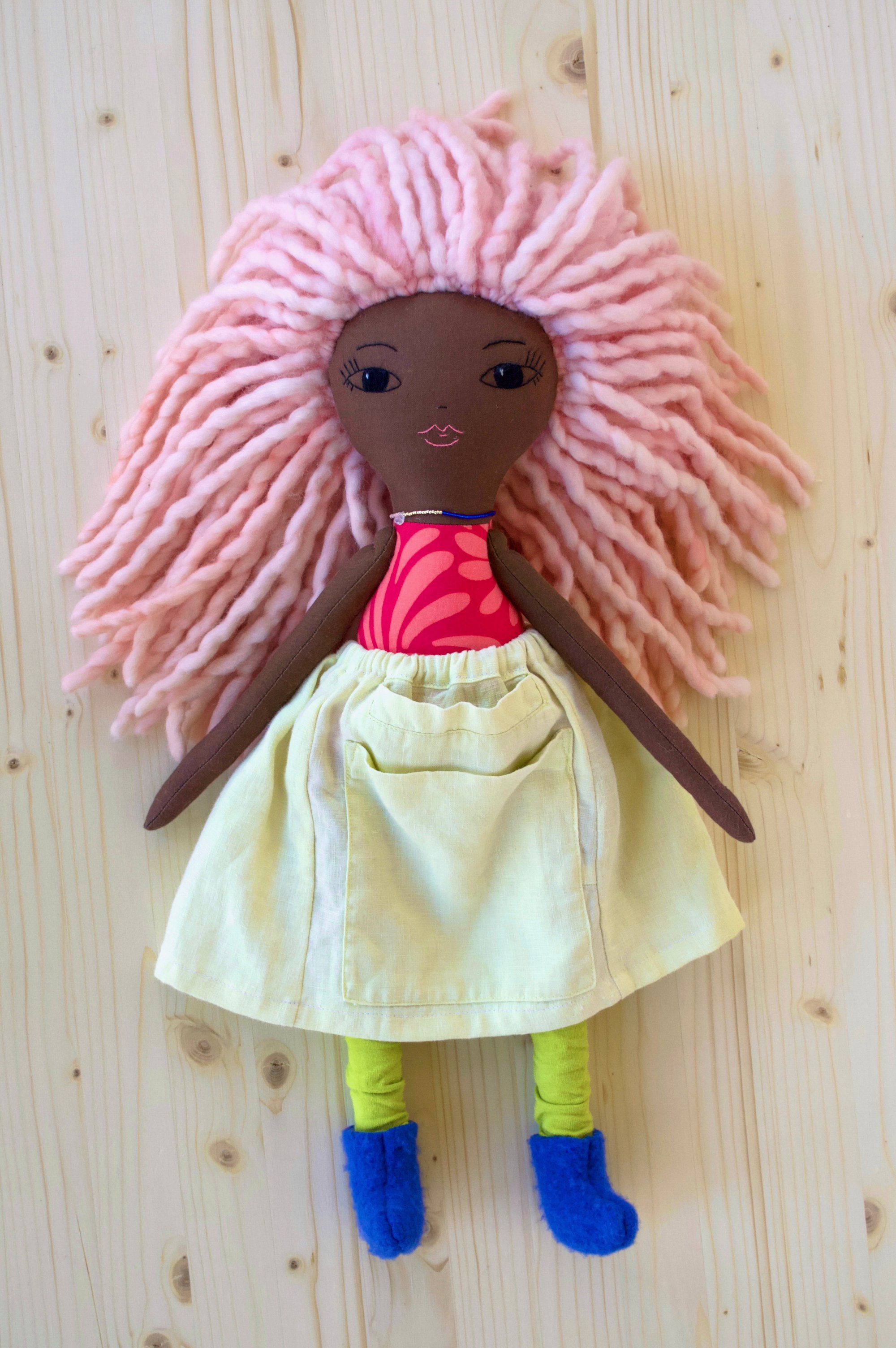 Koral's face, arms and legs are 100% Kona cotton. Her body is 100% cotton. Her skirt is 100% linen. Her hair is 100% wool. Her leg warmers are a cotton jersey. Her shoes are 100% felted wool felt. Her necklace is made of glass seed beads, a moonstone and a sterling silver clasp. She is 18".