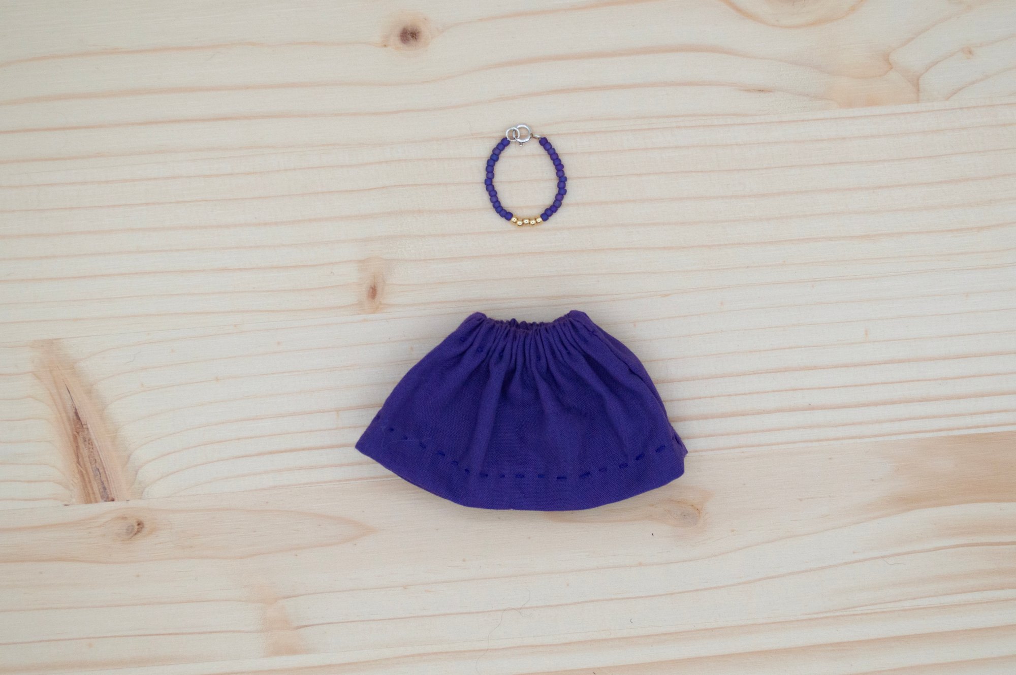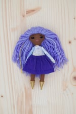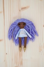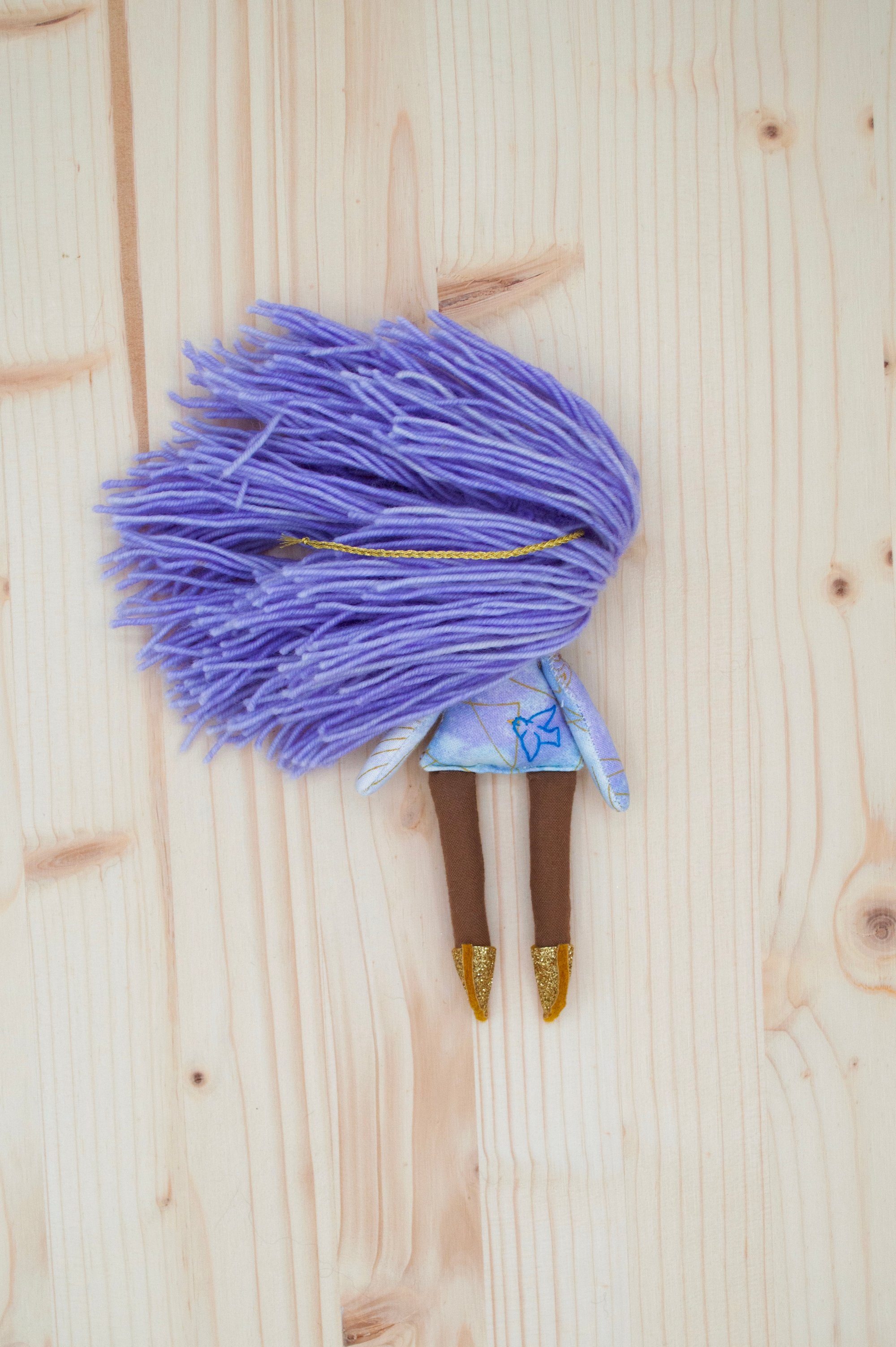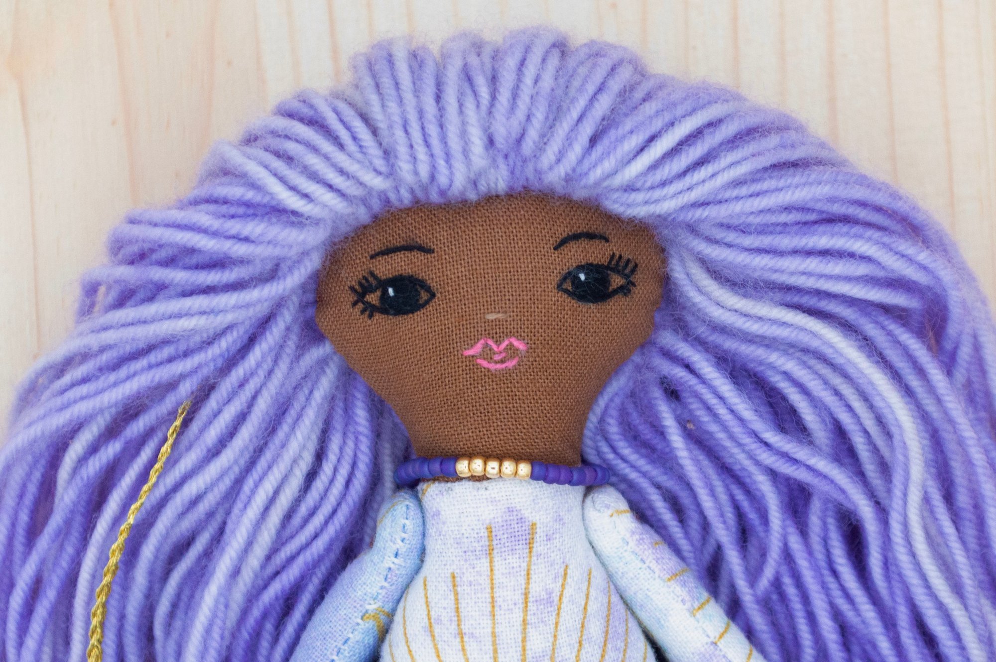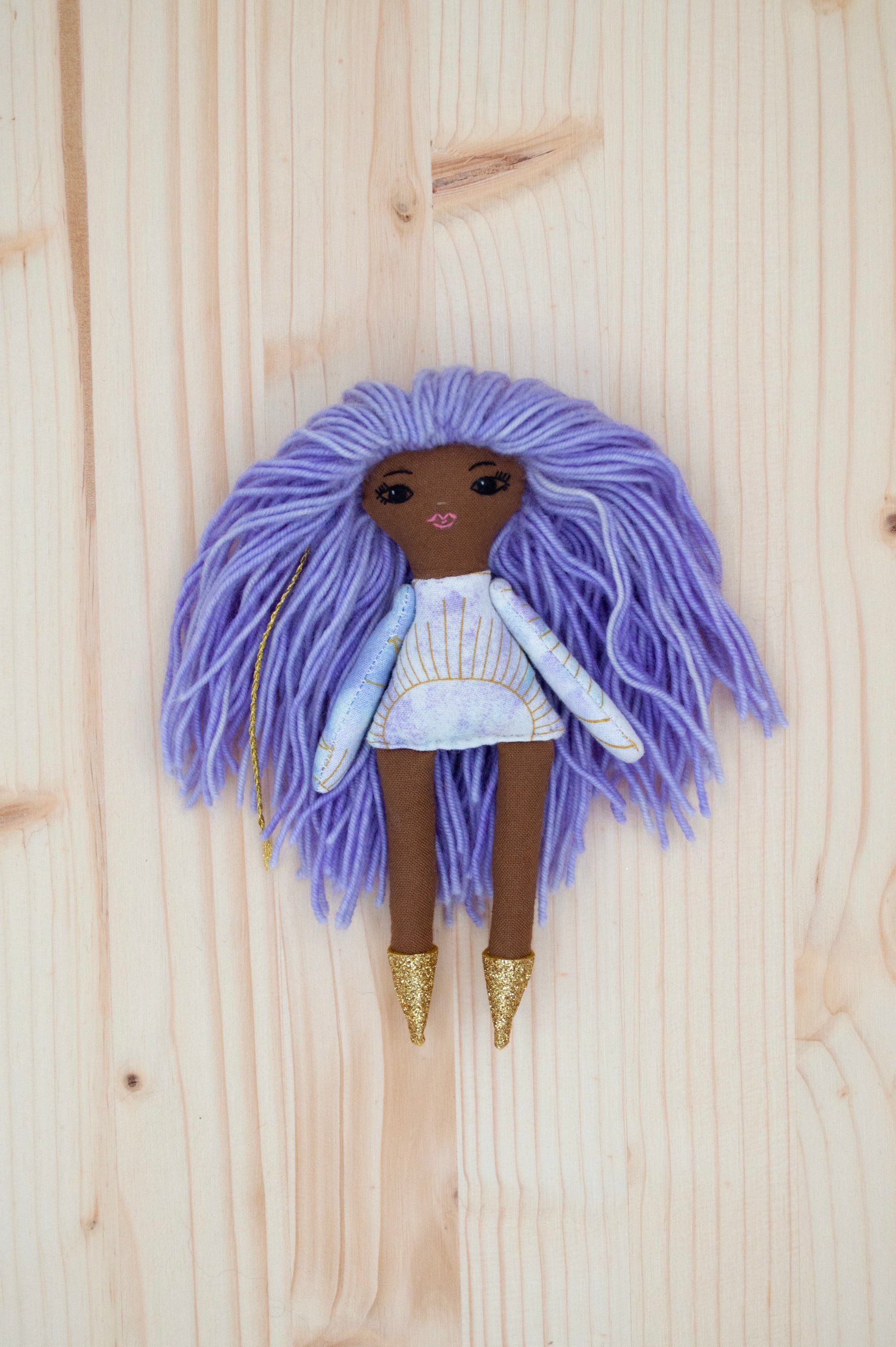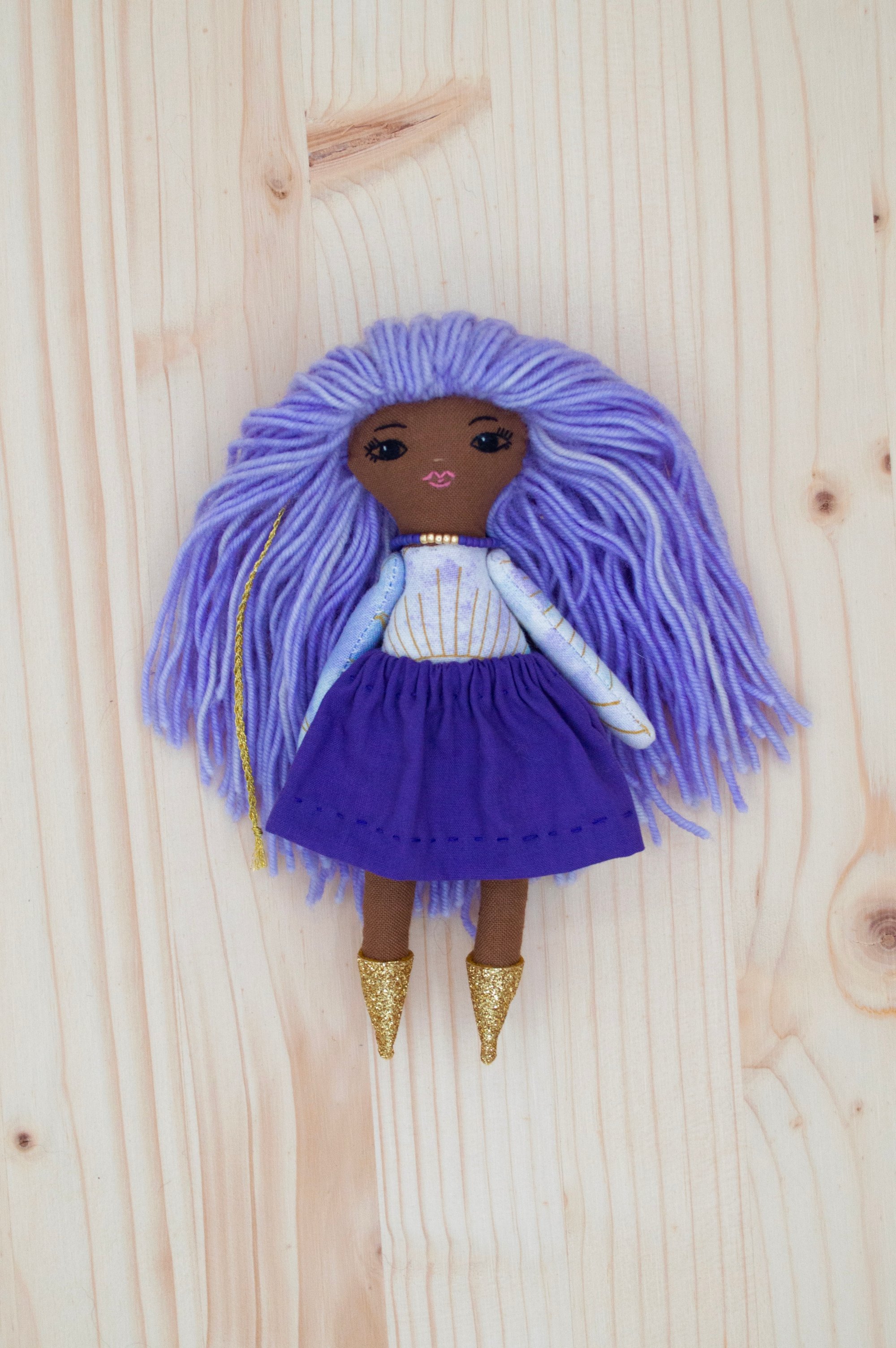 Luna’s face and legs are 100% Kona cotton. Her body, arms and skirt are 100% cotton. Her hair is 100% wool. Her shoes are 100% Bellwether wool felt with a no mess glitter finish. Her necklace is made of glass seed beads and a sterling silver clasp. She is 6".