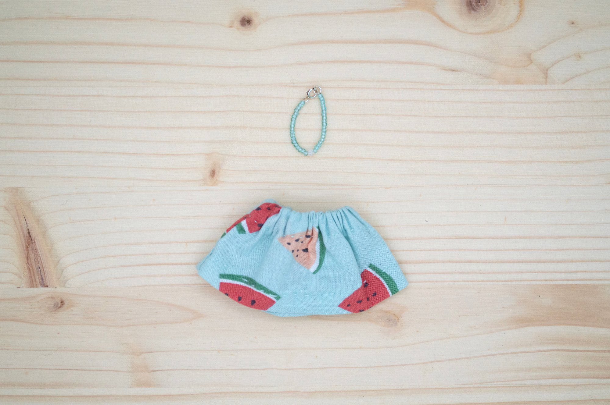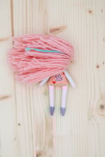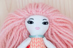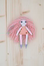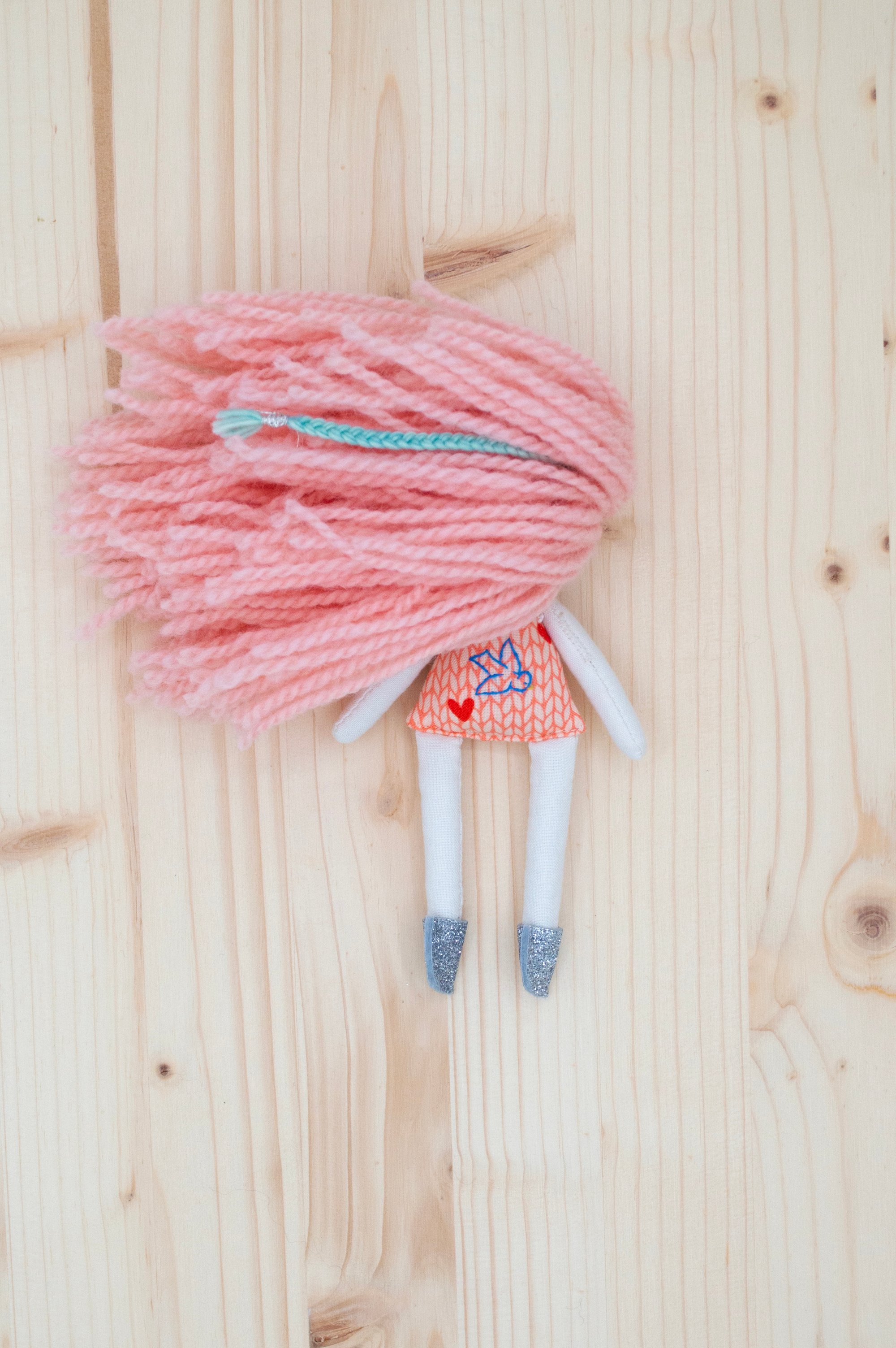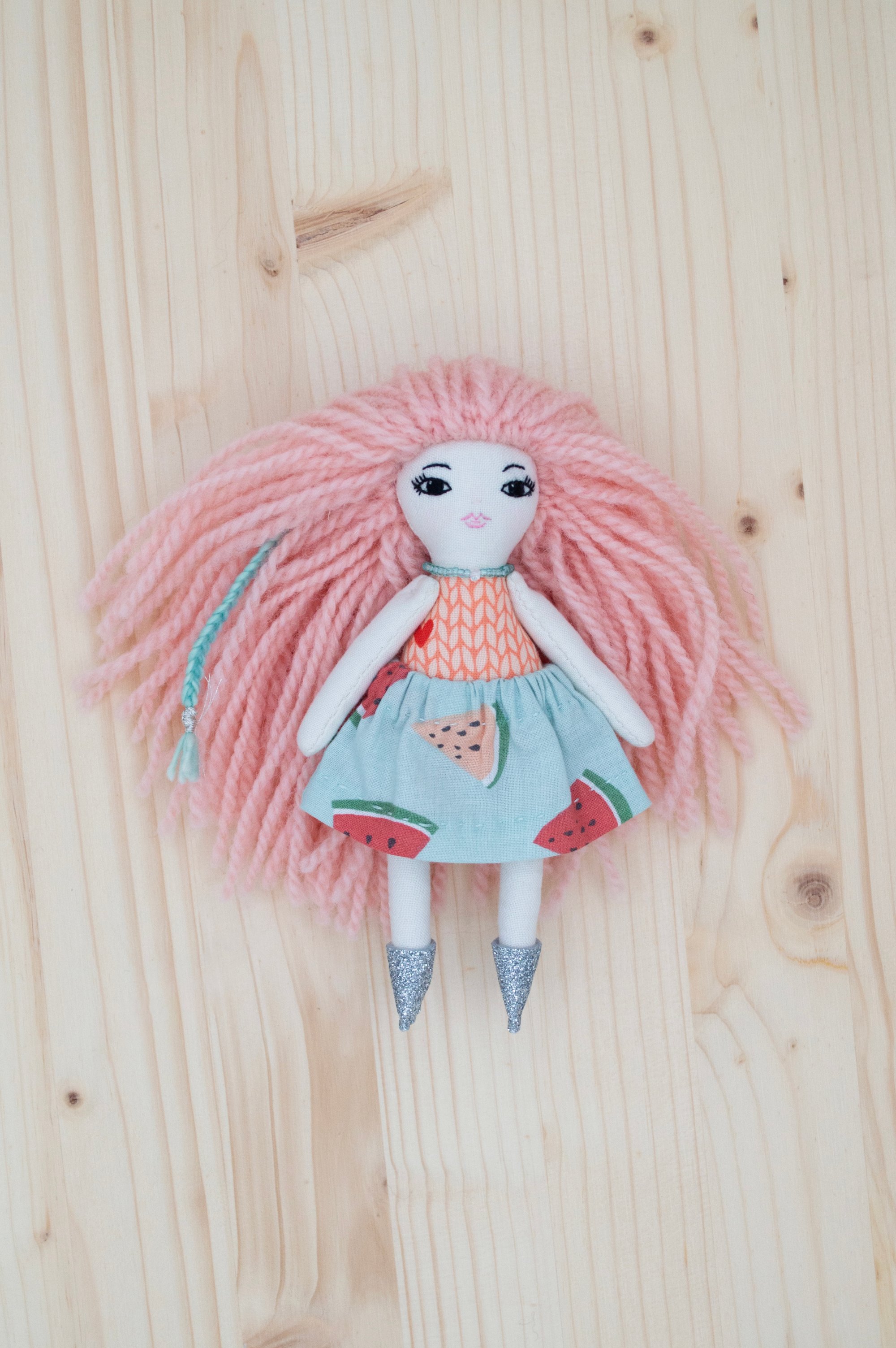 Melanie’s face, arms and legs are 100% Kona cotton. Her body and skirt are 100% cotton. Her hair is 100% wool. Her shoes are 100% Bellwether wool felt with a no mess glitter finish. Her necklace is made of glass seed beads, a tiny Herkimer diamond and a sterling silver clasp. She is 6".