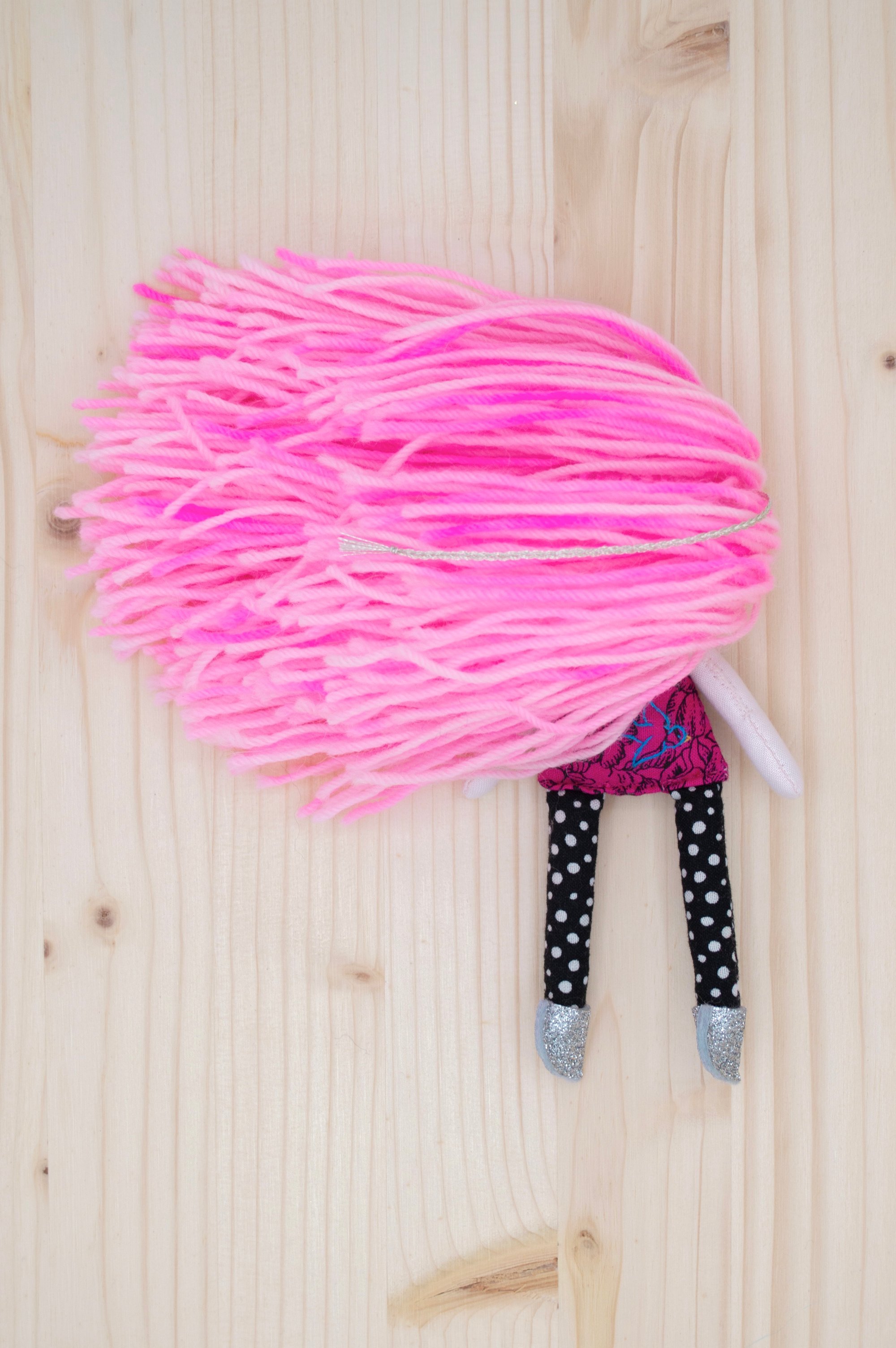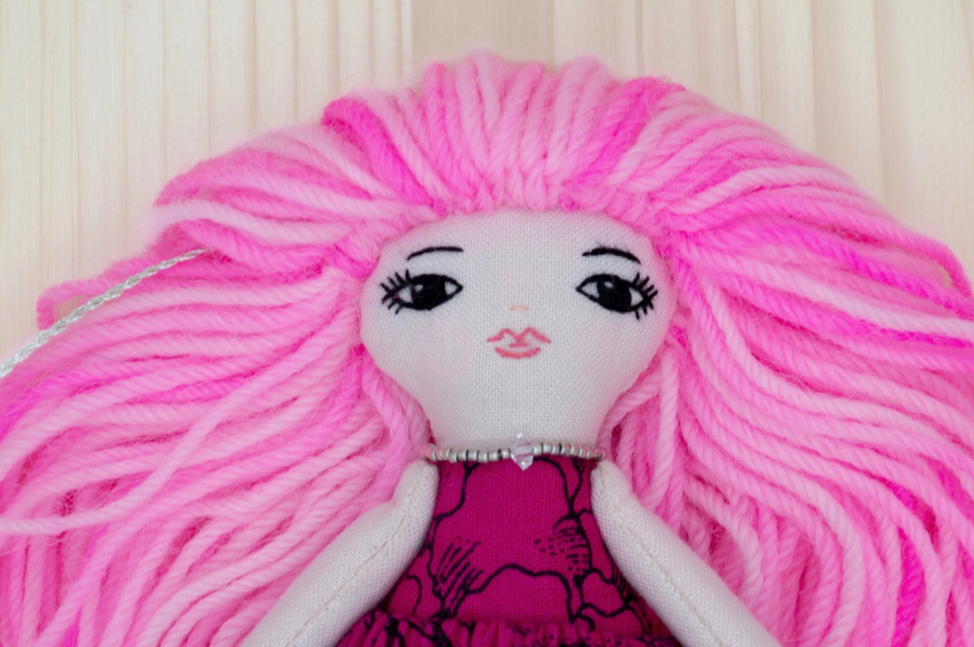 Rosalie's face and arms are 100% Kona cotton. Her body, legs and skirt are 100% cotton. Her hair is 100% wool. Her shoes are 100% Bellwether wool felt with a no mess glitter finish. Her necklace is made of glass seed beads, a tiny Herkimer diamond and a sterling silver clasp. She is 6".