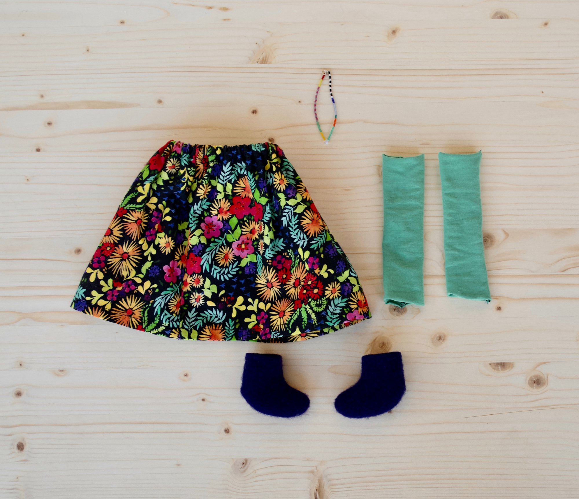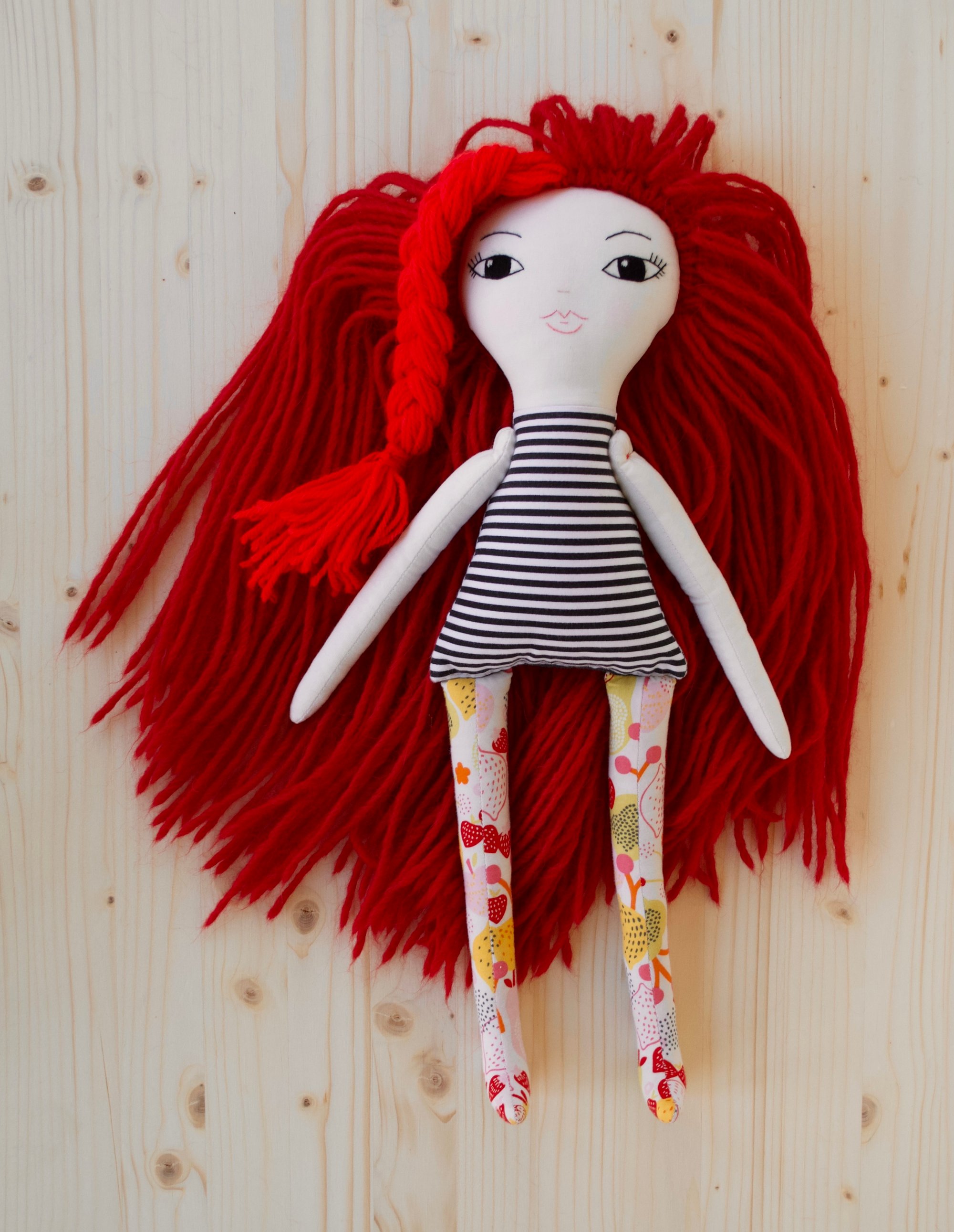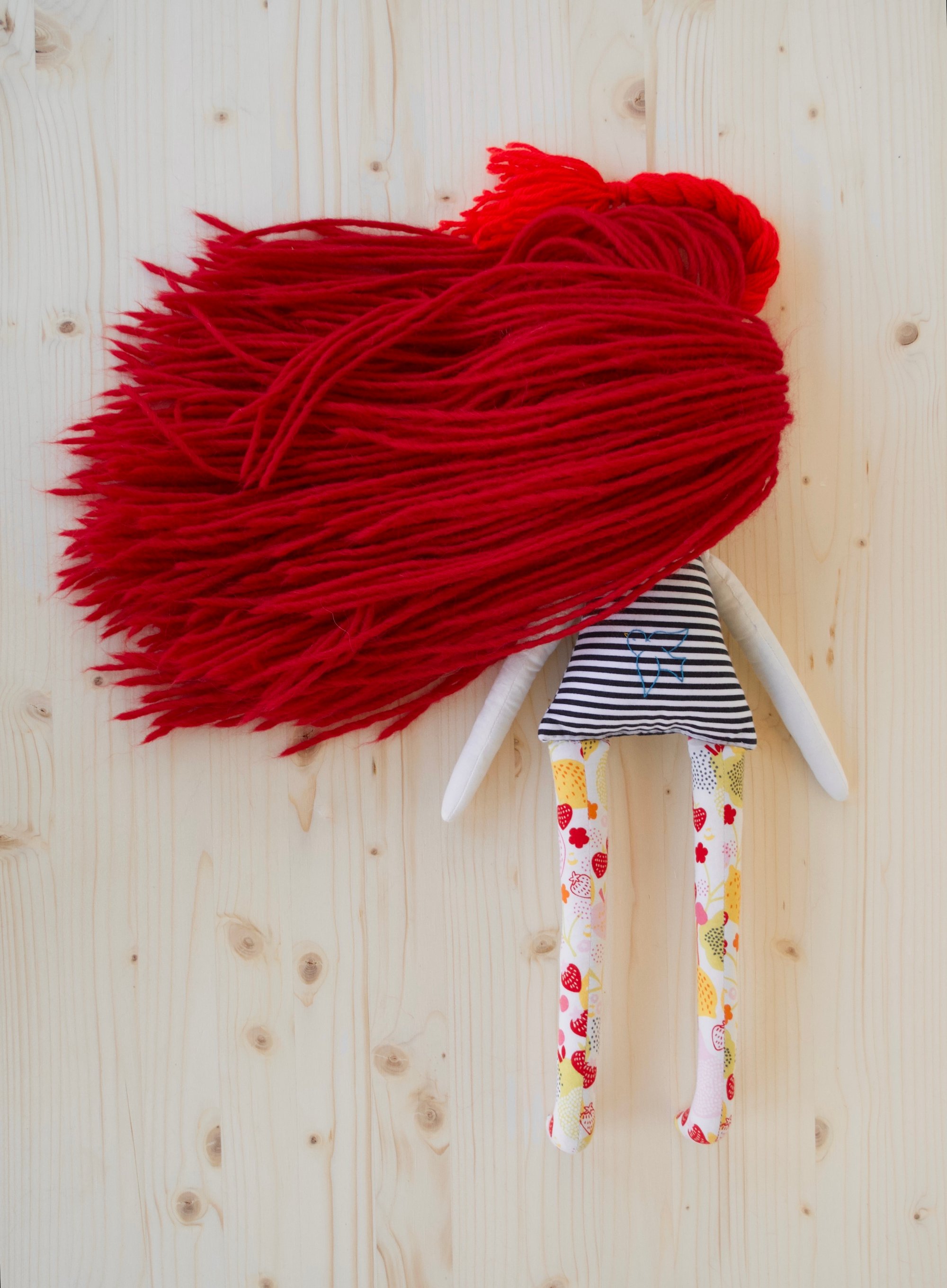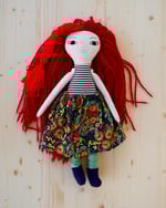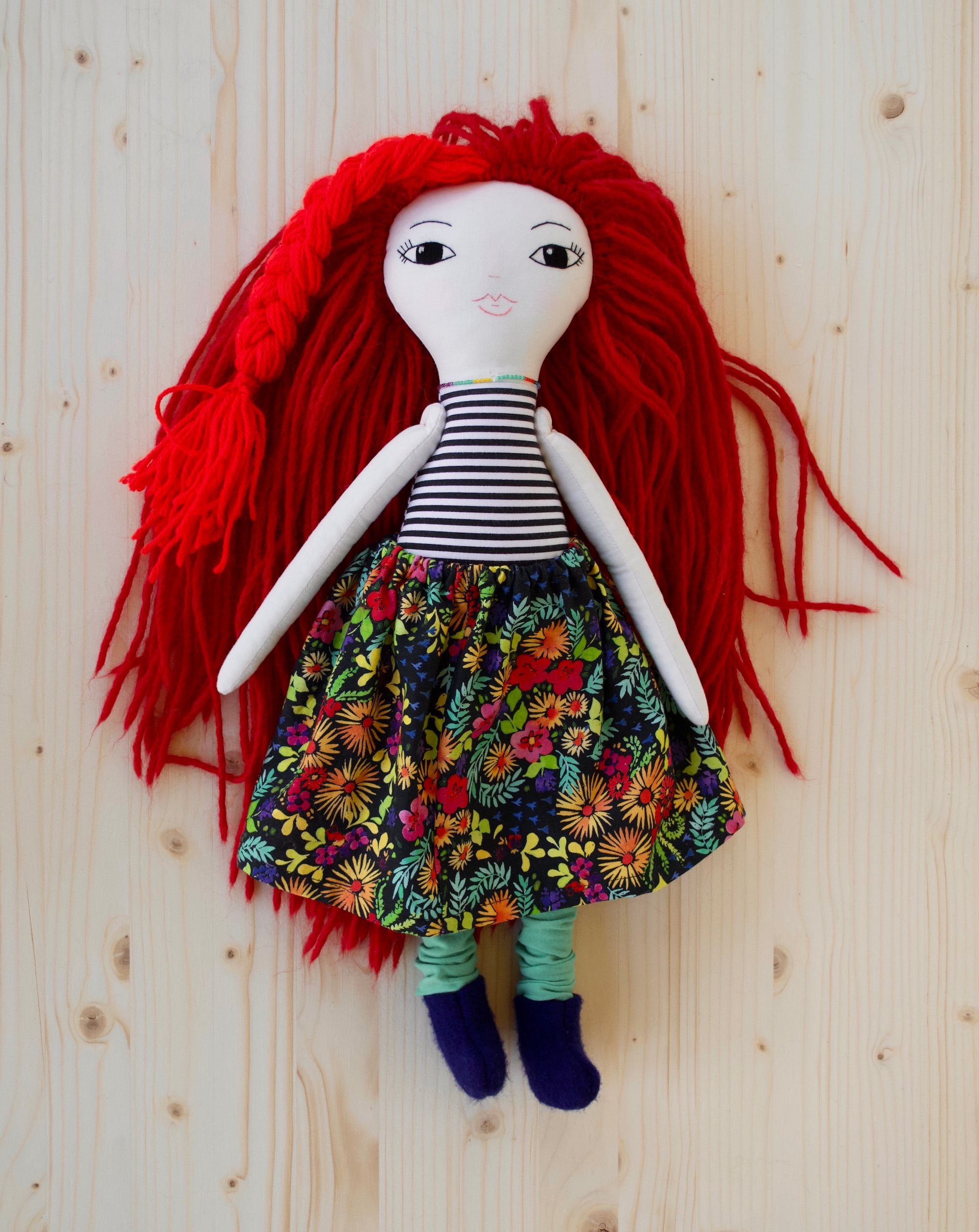 Ruby's face and anrms are 100% Kona cotton. Her body, legs and skirt are 100% cotton. Her hair is 100% wool. Her shoes are 100% felted wool. Her leg warmers are a cotton blend jersey. Her necklace is made of glass seed beads, a moonstone bead and a sterling silver clasp. She is 18".