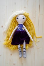 Her golden-yellow hair has a streak of white, like a sunbeam breaking through the clouds. Maybe it’s a mark of all her grand adventures, or maybe it’s just a little bit of magic. Either way, it makes her truly one of a kind. Sunny is full of personality, one moment she’s twirling in her velvet skirt, the next she’s cozy in striped leg warmers, always ready for whatever the day brings. A doll made for play, dress-up, and endless stories waiting to be told.
