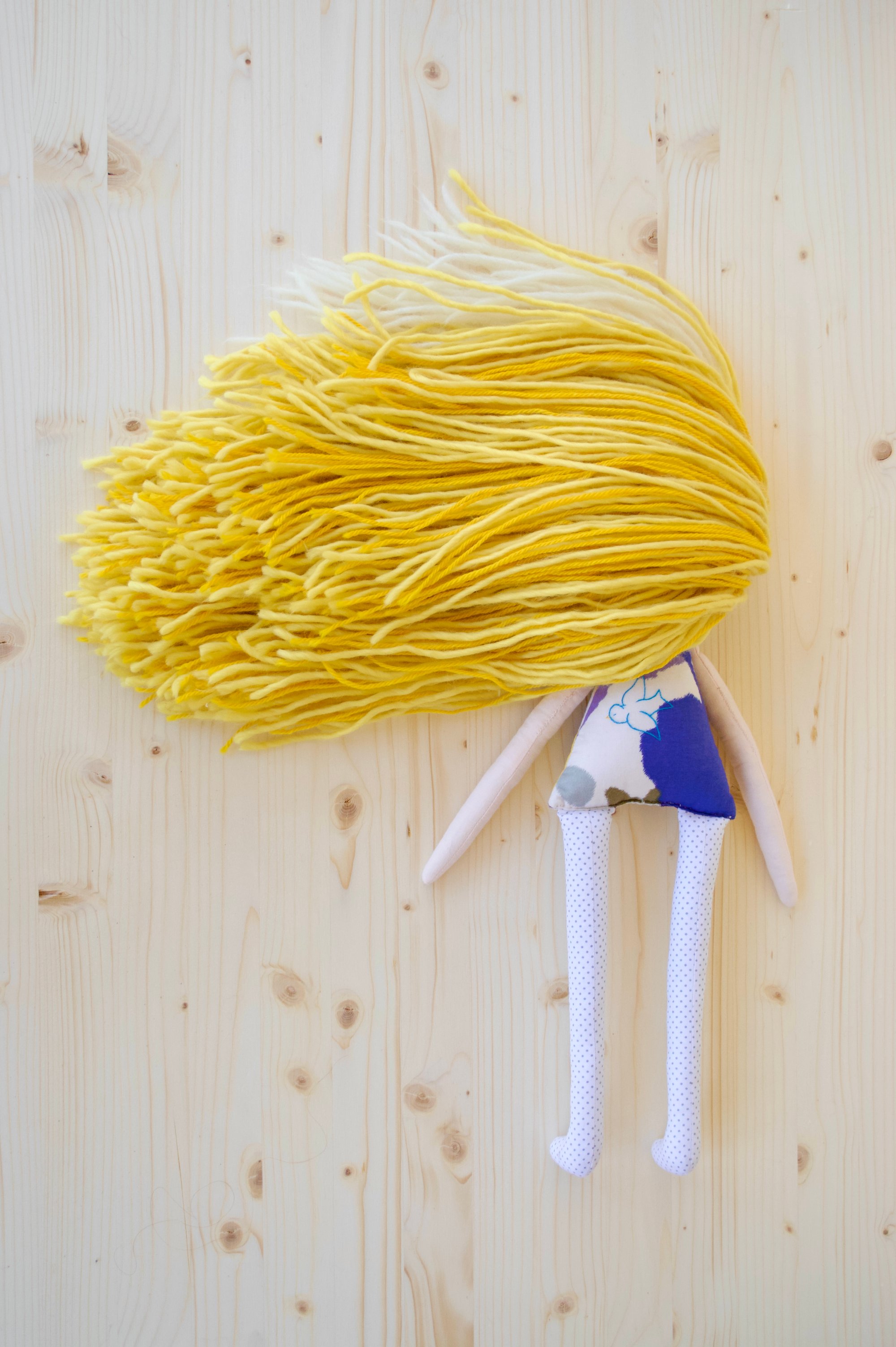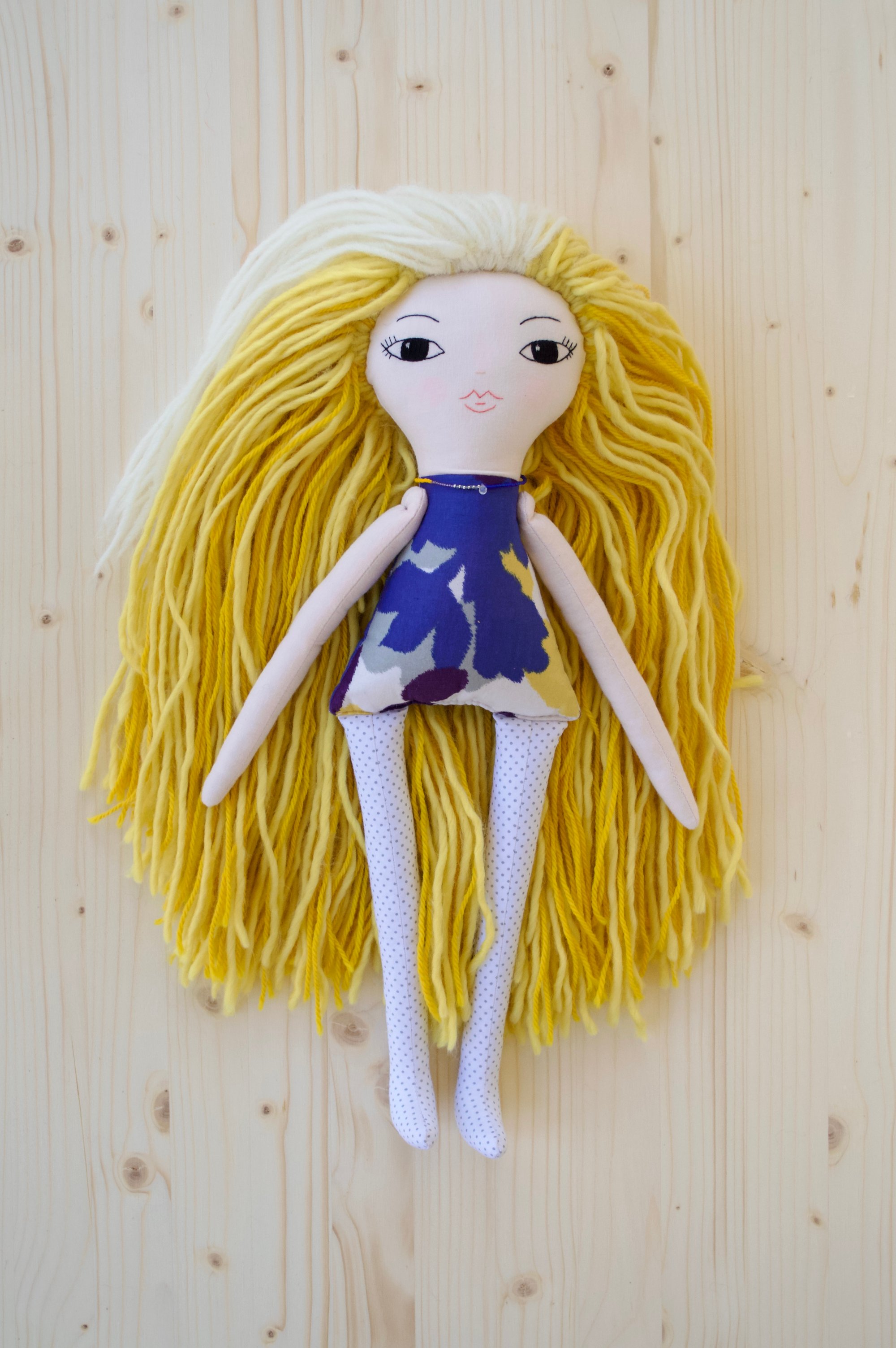 Luna’s face and anrms are 100% Kona cotton. Her body and legs are 100% cotton. Her hair is a wool blend. Her shoes are 100% felted wool. Her necklace is made of glass seed beads, a moonstone and a sterling silver clasp. She is 17.5".