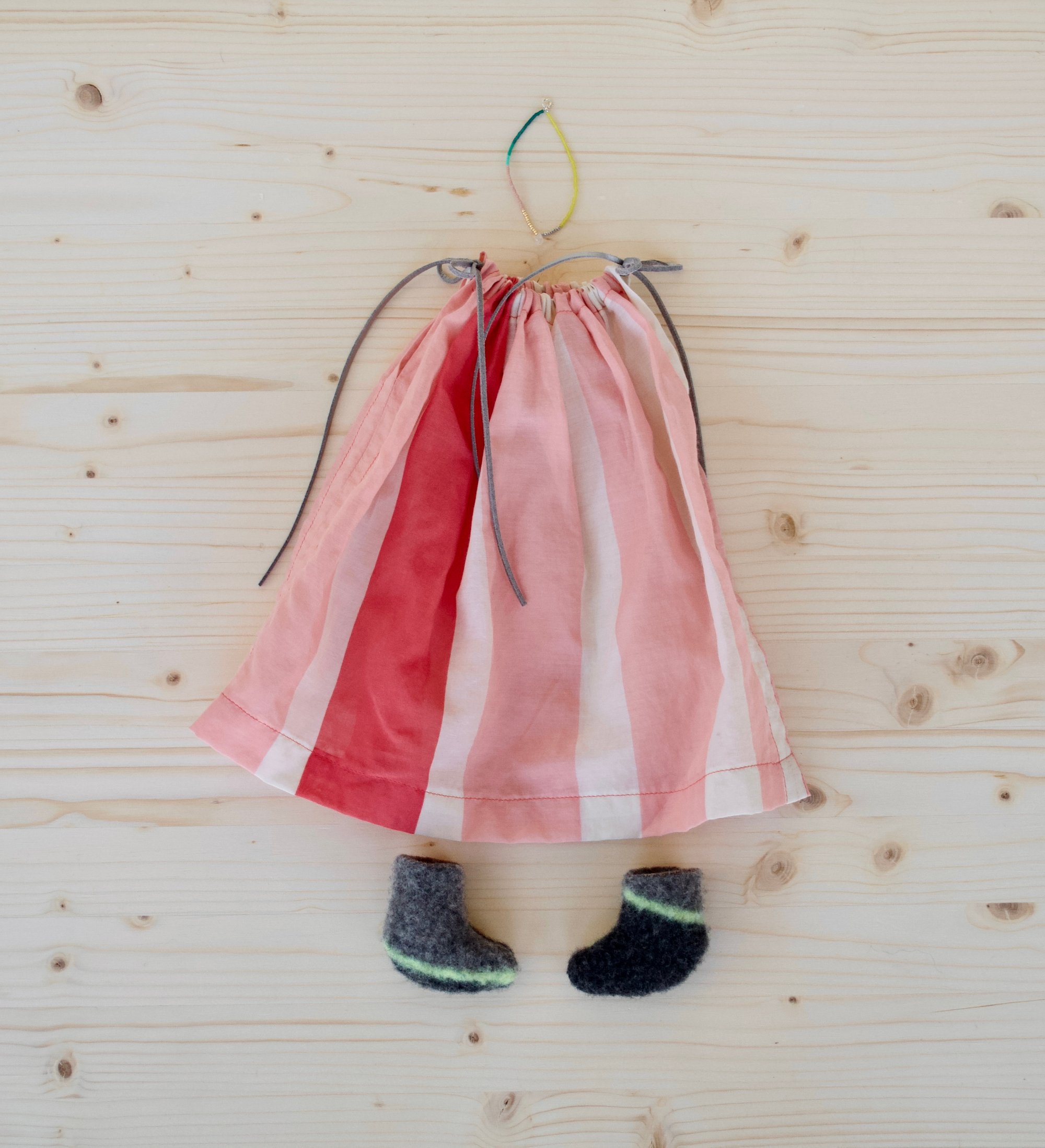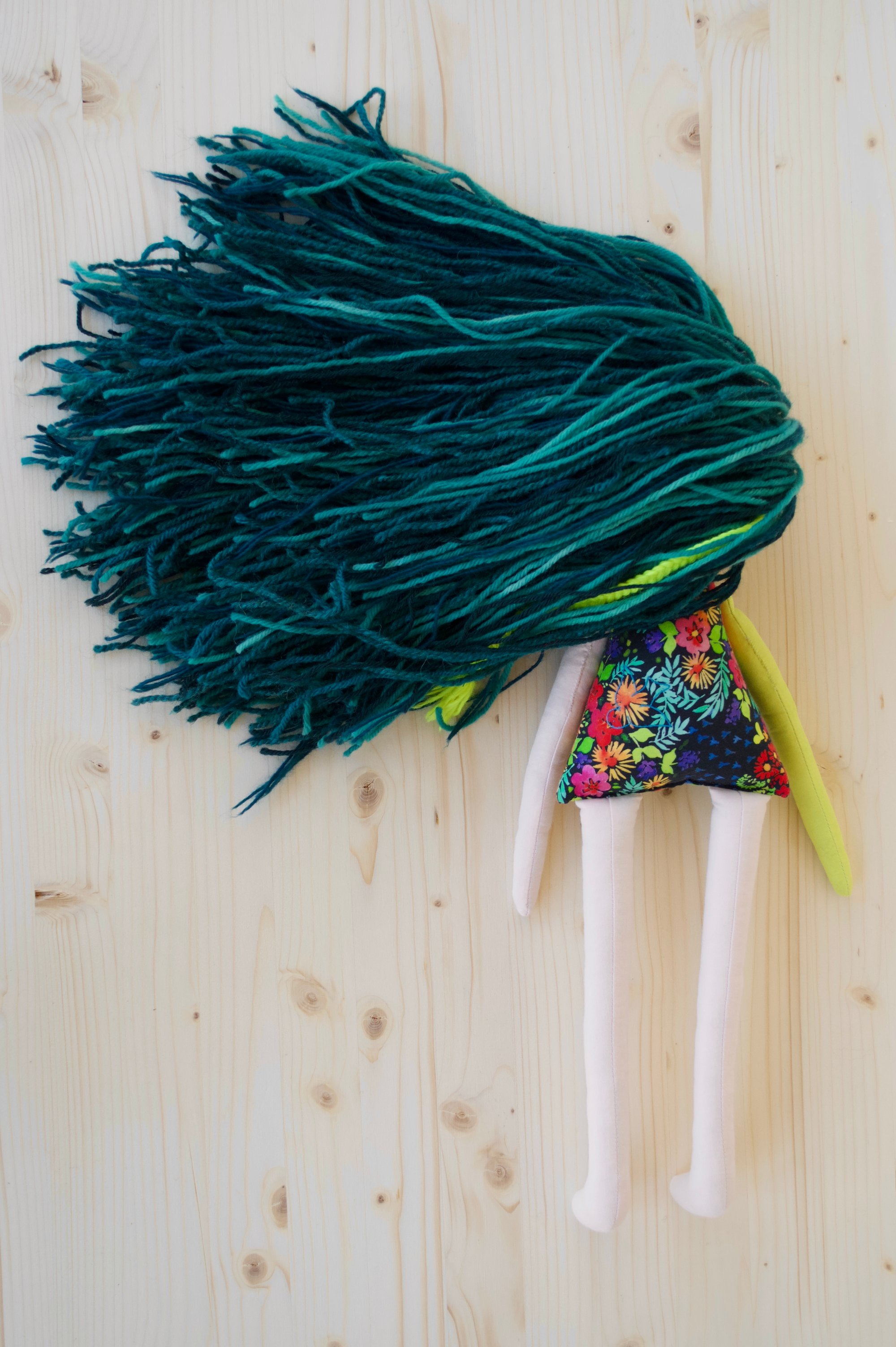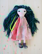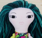 Talula's face, left arm and legs are 100% Kona cotton. Her right arm and body are 100% cotton. Her hair is a wool blend. Her shoes are 100% felted wool. Her dress is 100% slik with faux leather ties. Her necklace is made of glass seed beads, a moonstone and a sterling silver clasp. She is 18".